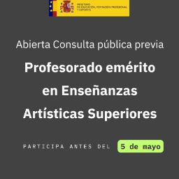Se ha iniciado el trámite de consulta pública previa del proyecto de Real Decreto que determinará los requisitos para la designación y las funciones del Profesorado emérito en las Enseñanzas Artísticas Superiores. En esta fase, previa a la redacción del borrador, se busca conocer las necesidades y perspectivas del sector. El plazo de participación estará abierto hasta el 5 de mayo.